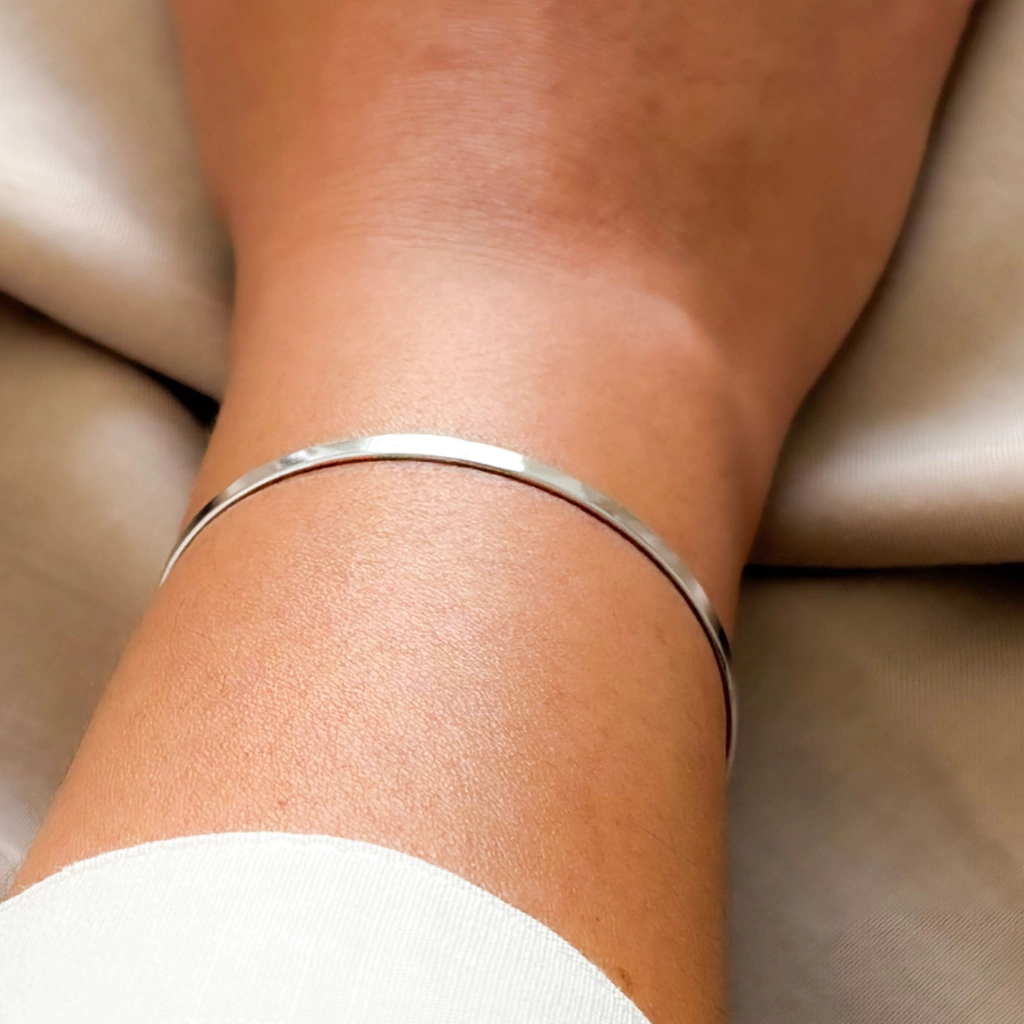 Banhado a ródio branco, com design clean e acabamento espelhado que reflete brilho sofisticado. Moderno e versátil, valoriza o pulso com elegância sutil e um toque de luxo atemporal.