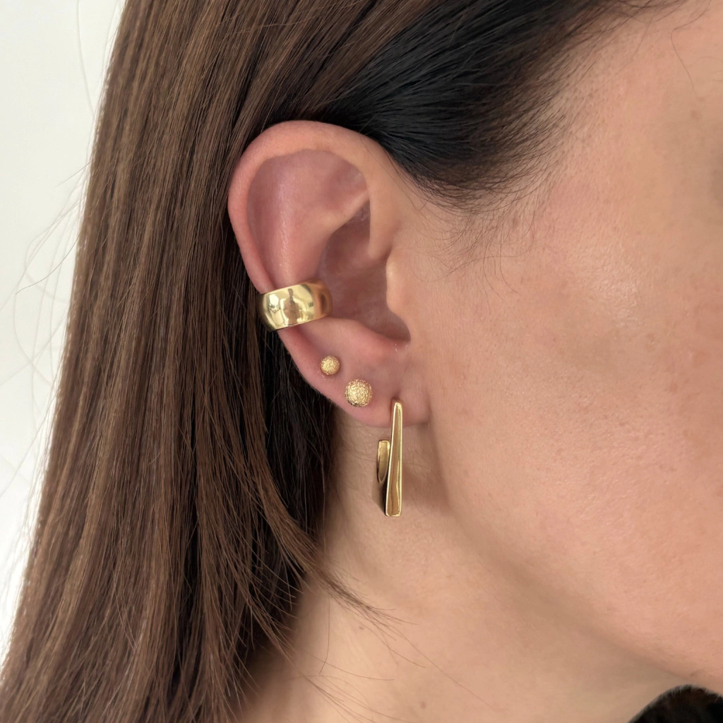 Design arquitetônico com linhas retas e acabamento em ouro 18k. Elegante, marcante e perfeita para destacar seu estilo em qualquer look.