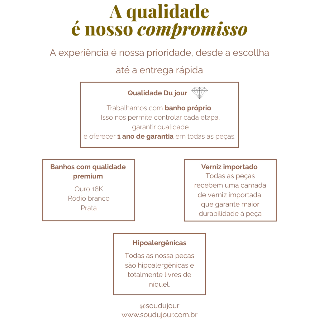 Todas as peças da Du Jour são níquel free e hipoalergênicas, proporcionando conforto e segurança no uso até para as peles mais sensíveis. Trabalhamos com banhos de qualidade premium, aplicando alta camada de prata, ouro 18k e ródio, que garantem um acabamento sofisticado e longa vida útil às nossas semijoias. Além disso, cada peça é finalizada com um verniz de proteção importado, desenvolvido para preservar o brilho e oferecer ainda mais resistência ao desgaste do tempo.